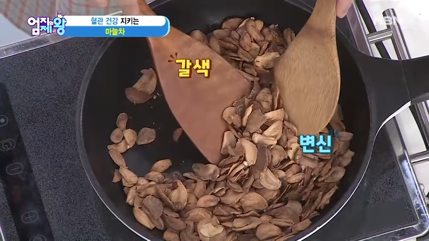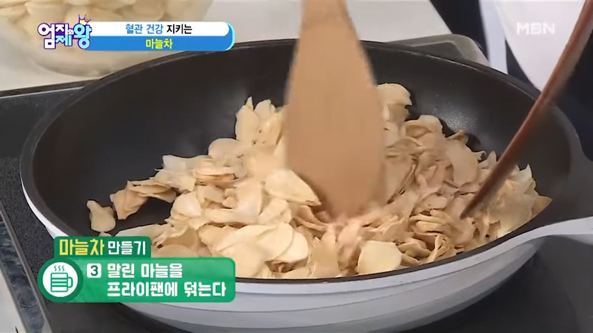 말린 마늘을 프라이팬에 볶아주되, 갈색으로 변할 때까지 볶습니다.
