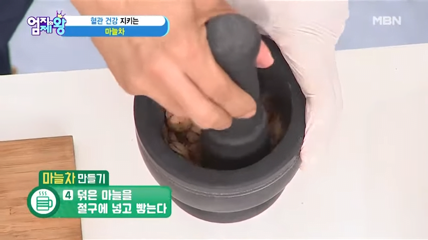 이제 볶은 마늘을 절구에 넣어 빻아줍니다.