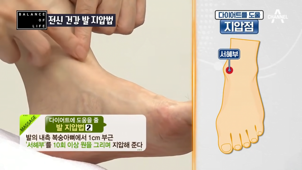 두 번째는 발의 내측 복숭아뼈에서 1cm 부근의 서해부를 10회 이상 원을 그리며 지압해줍니다.