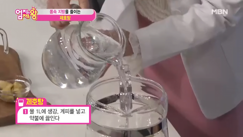 물 1L에 생강과 계피를 넣고 약불에서 1시간 끓여줍니다.
