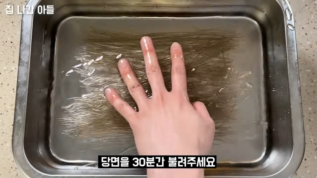 그 다음으로 당면을 넣어주세요. 약 30분에서 1시간 동안 당면을 불려주시면 됩니다.
