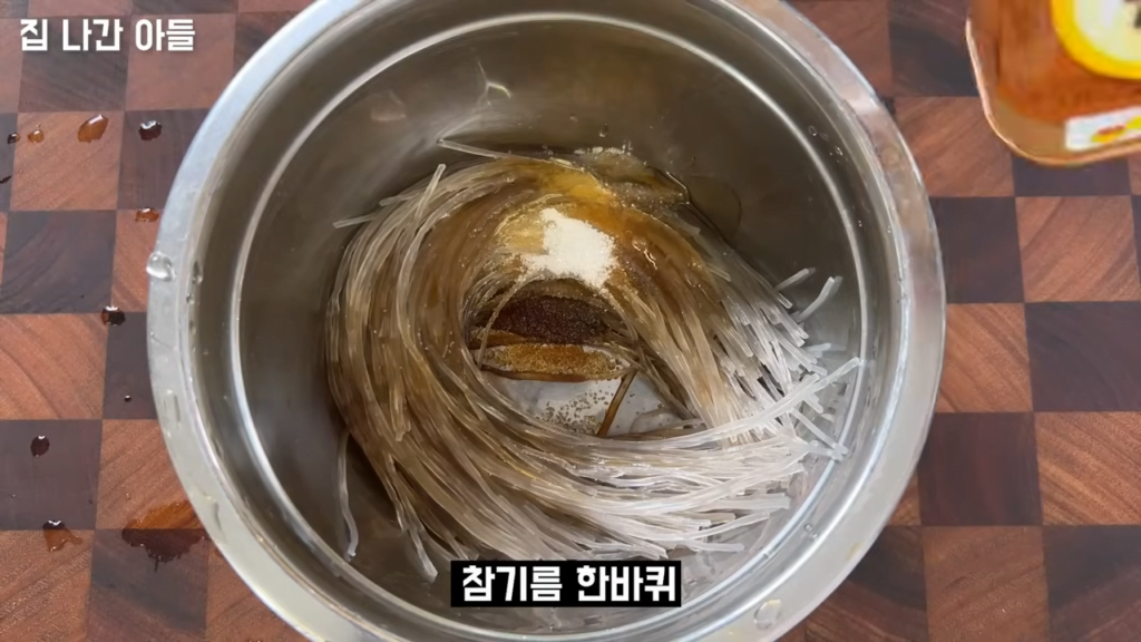 잘 불린 당면에 진간장 세 스푼을 넣고, 그 다음에 설탕 한 스푼을 넣어주세요. 마지막으로 참기름을 넣고 잘 섞어주시면 됩니다.