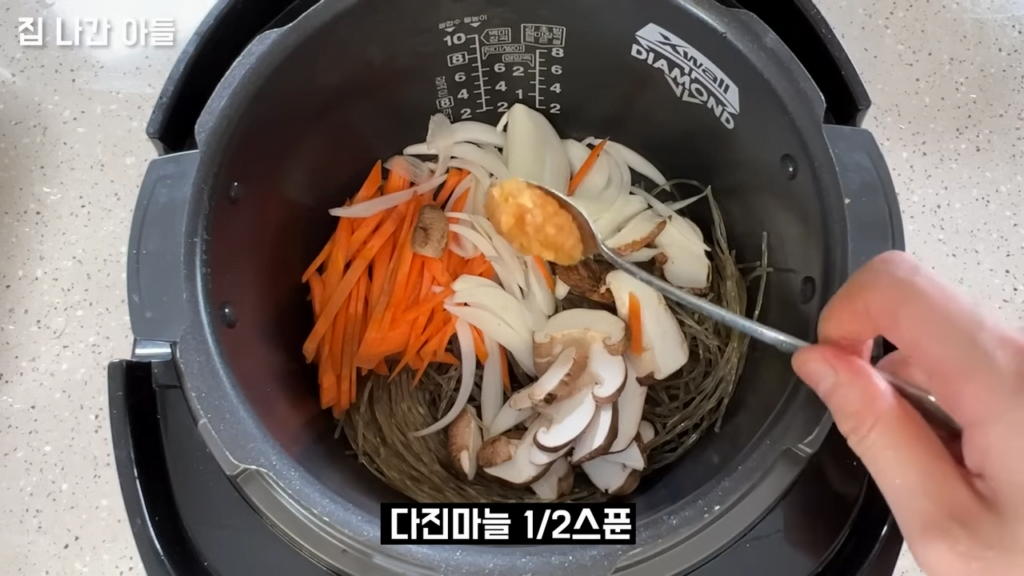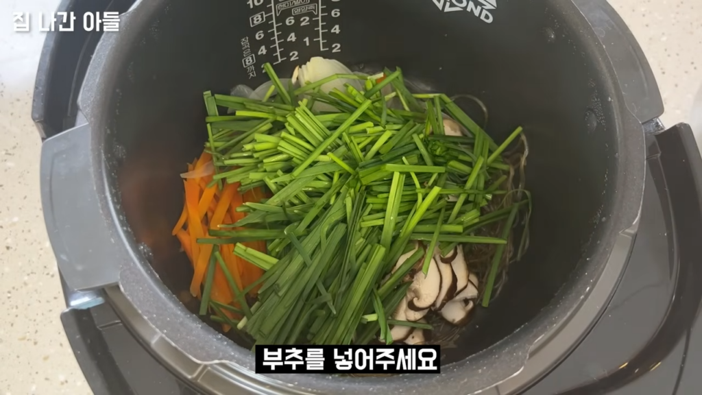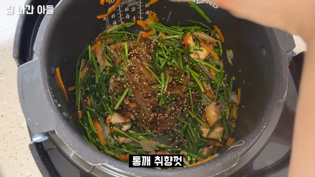 밥솥에 당면과 야채를 넣은 잡채 요리